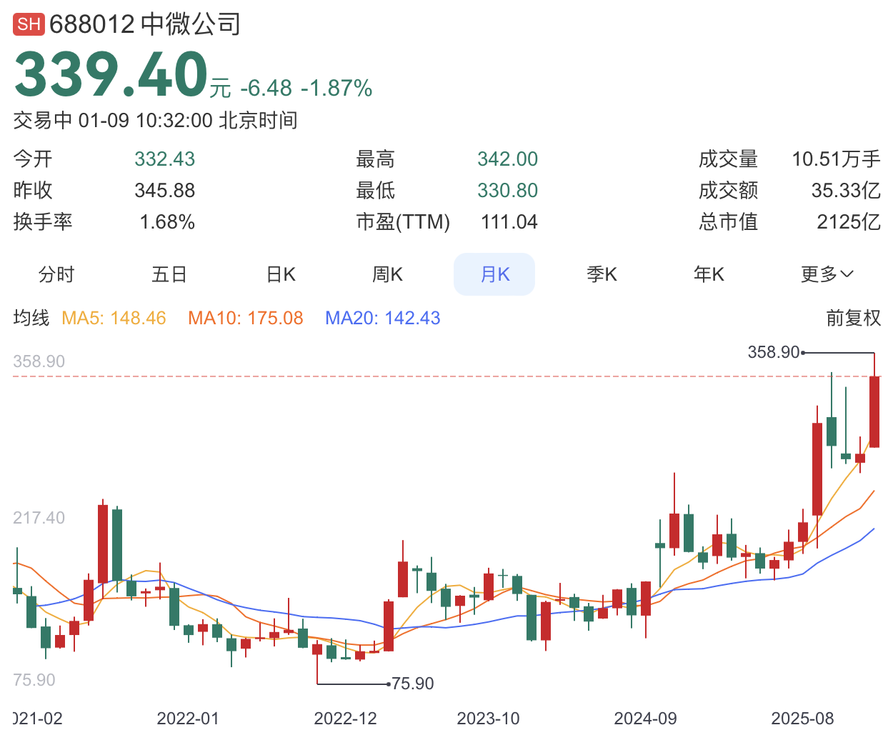 截至发稿,中微公司股价为339.40元,总市值2125亿元。过去3年,中微公司股价上涨超过3倍。