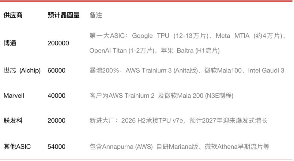 整个ASIC阵营,大致可以划分为博通、世芯(AI Chip)、Marvell和联发科几家,其中博通是领头羊。