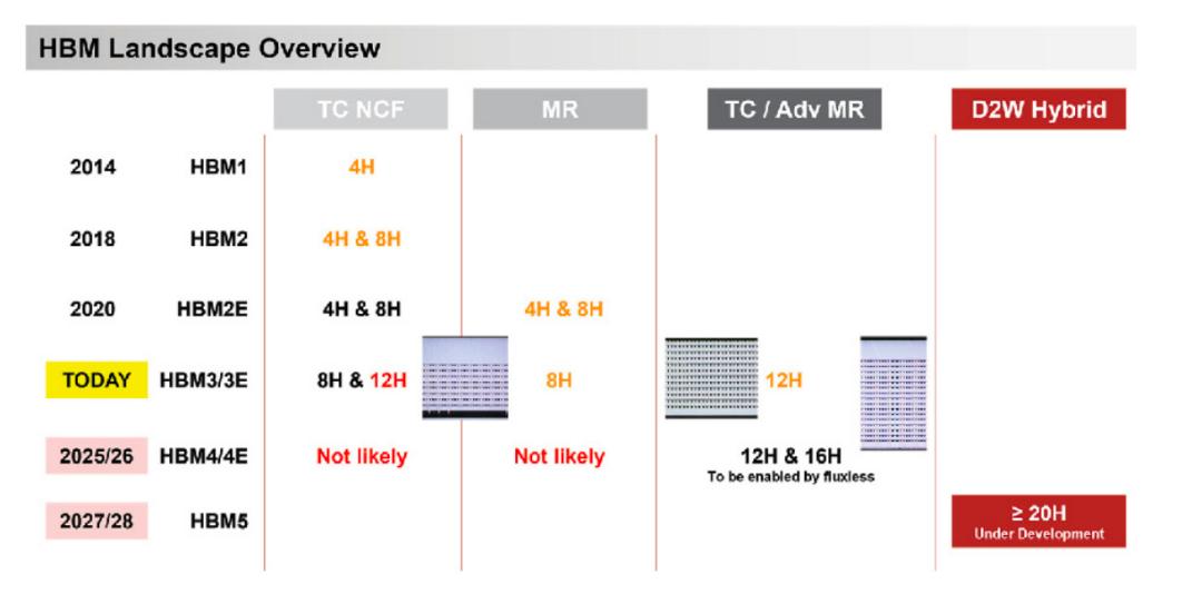 ASMPT认为,在下一代 HBM 中(见下图),Flux-TCB 已具备 HBM 量产资格,且已用于最高 12 层的 HVM(高产量制造);而 AOR TCB 已在 12~16 层范围内展示出成功实现的能力,从而进一步支撑 HBM 路线图。这一经验证的能力确保:可在覆盖全部层数的前提下,严格控制堆叠芯片的间隙高度,从而赋能下一代HBM——这是满足最新 HPC 与 AI 器件性能需求的关键。