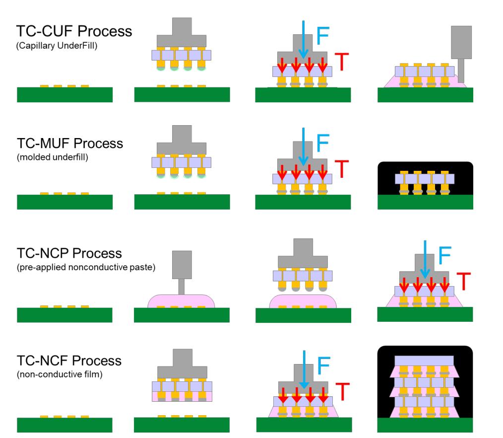 TCB 的四种主要类型包括:毛细管底部填充 TCB (TC-CUF)、模塑底部填充 TCB (TC-MUF)、非导电胶 TCB (TC-NCP) 和 非导电膜 TCB (TC-NCF)(来源:BESI)