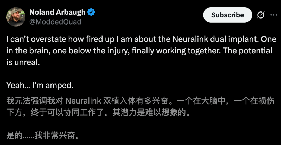 甚至,Noland Arbaugh本人兴奋地表示,大脑+脊髓,双向通路,才算是真正意义上的「闭环」恢复。