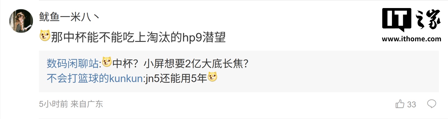后续有用户在评论区询问:“期待下一代大杯有没有什么背屏新玩法”,博主回复道:“有个花活儿,我先保密,等落地”;另一名用户则询问道:“那中杯能不能吃上淘汰的 hp9 潜望”,博主则回复道:“中杯?小屏想要 2 亿大底长焦?”。