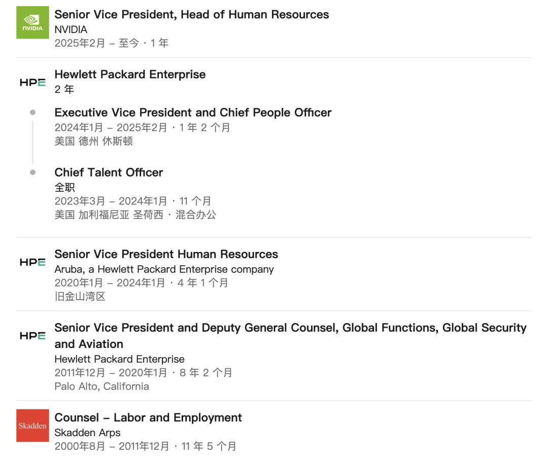 在人力资源这条线上,英伟达选择了一位传统科技公司体系中走出来的老将。