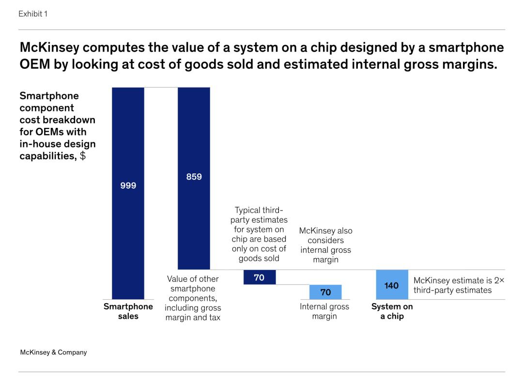 2、对于拥有自主设计的OEM厂商而言,大多数分析师仅通过考察销售成本(主要通过支付给代工厂的芯片制造费用)来评估自主设计的片上系统(SoC)的价值。这类分析忽略了预估的内部毛利率——即假设供应商向最终产品制造部门销售芯片所获得的利润——尽管在量化IDM厂商和无晶圆厂厂商的贡献时,这些毛利率已被纳入考量。我们的方法通过同时考虑拥有自主设计的OEM厂商的销售成本和预估的内部毛利率,确保了更高的分析一致性(见图表1)。
