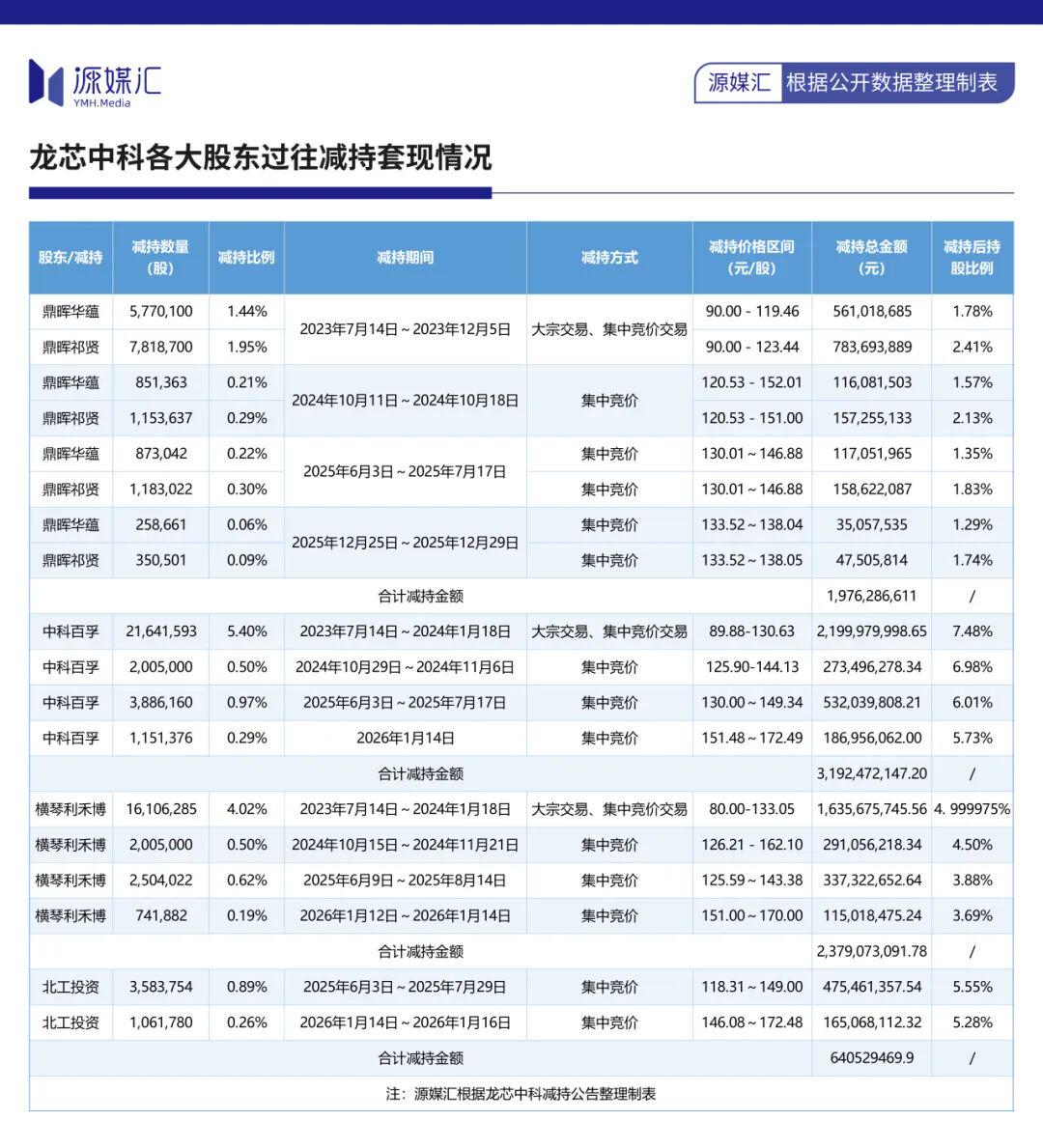 2024年至2025年,宁波鼎晖祁贤、上海鼎晖华蕴和中科百孚三家股东,对龙芯中科实施了共计五轮减持,合计套现约14.37亿元。加上最新的2026年1月14日中科百孚再度减持套现1.87亿元,算下来,近三年间,应伟关联的三家企业,累计减持套现约51.68亿元。