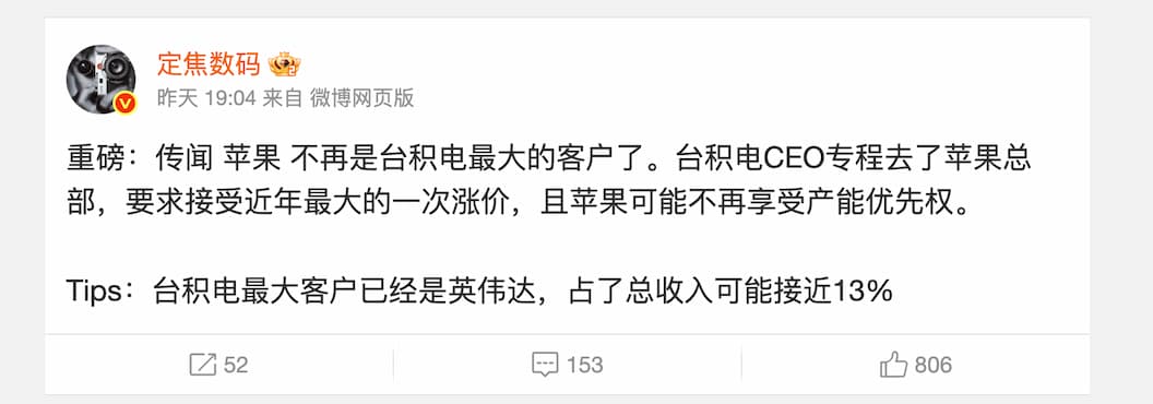 然而,台积电可能会取消苹果在其合作伙伴关系中的优先地位。此前有消息称,苹果在2024年将占台积电年收入的24%,而英伟达将在2025年超越苹果。现在,据微博爆料人“定焦数码”透露,台积电CEO魏哲家的到访给苹果带来了一个令人震惊的消息:魏哲家要求苹果支付“近年来最大幅度涨价”。