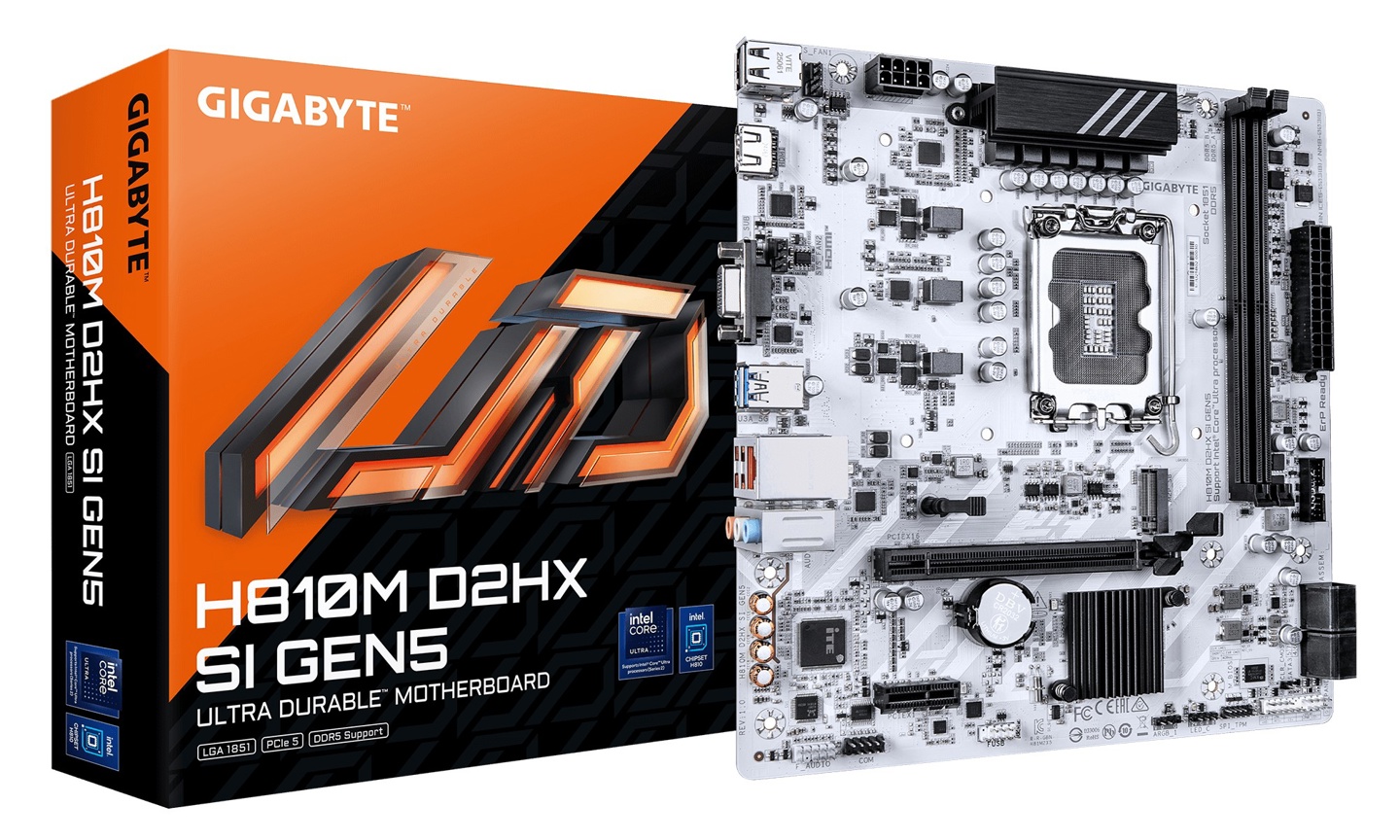 技嘉的这款 H810 主板属于入门级白色 PCB 型号,搭载 6+1+1 相供电,提供 1 条 PCIe 5.0×16 插槽、1 条 PCIe 3.0×1 插槽、1 个 PCIe 4.0×4 的 M.2 2280 盘位,配备瑞昱 RTL8125 2.5GbE 有线网卡,还保留了 D-Sub (VGA) 接口。