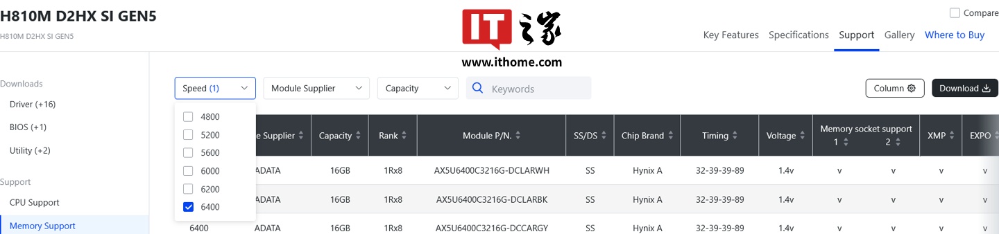 不过,根据台媒 UNIKO's Hardware 的发现,技嘉最近推出的 H810M D2HX SI GEN5 主板在产品规格页面赫然写有支持内存超频到 8800MT/s 的信息: