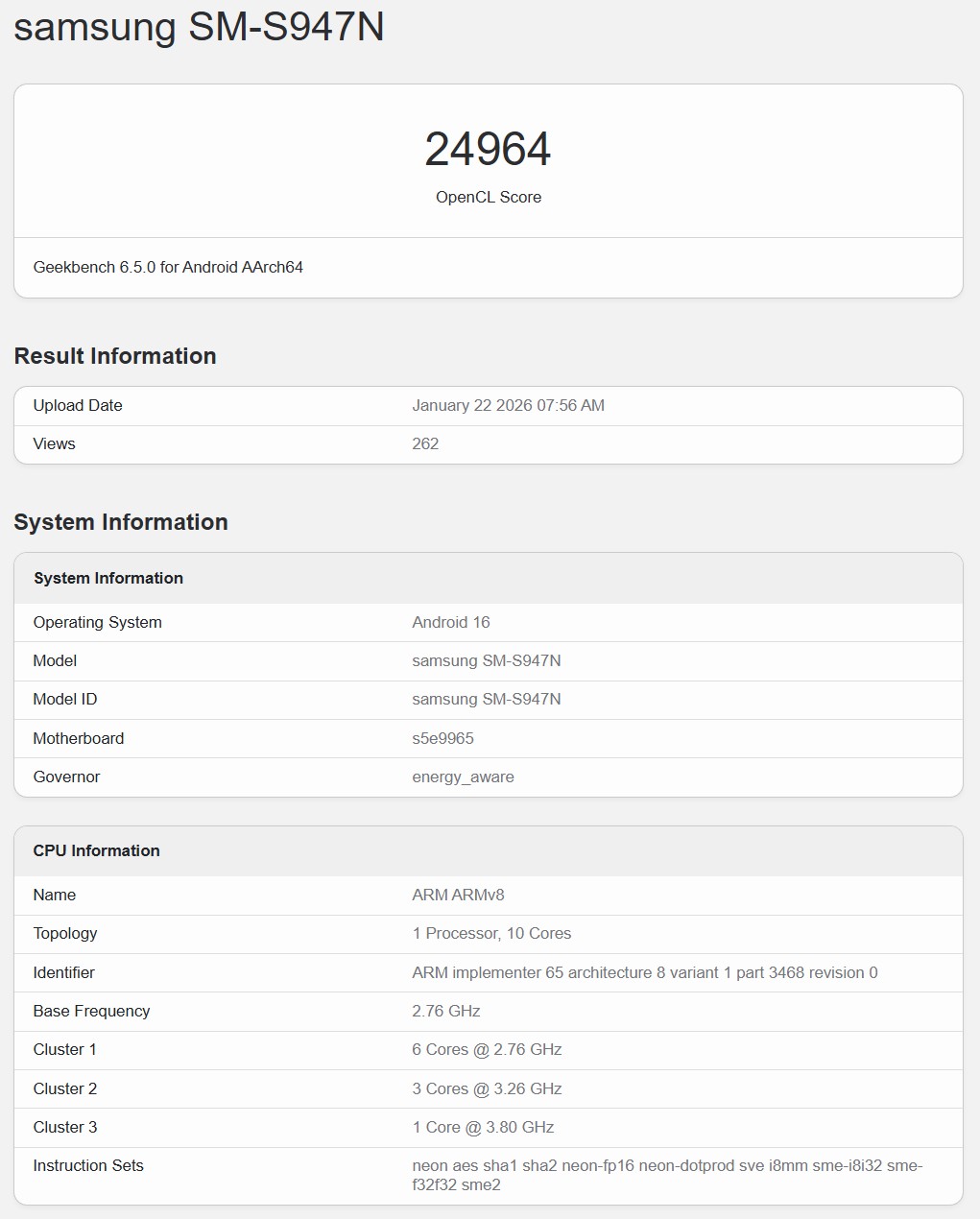IT之家 1 月 23 日消息,科技媒体 Wccftech 昨日(1 月 22 日)发布博文,报道称全球首款 2nm GAA 工艺芯片 Exynos 2600 再次现身 GeekBench 跑分库,在 OpenCL 中取得 24964 的高分,比高通笔记本级芯片骁龙 X Elite(20492 分)高出约 21.8%。