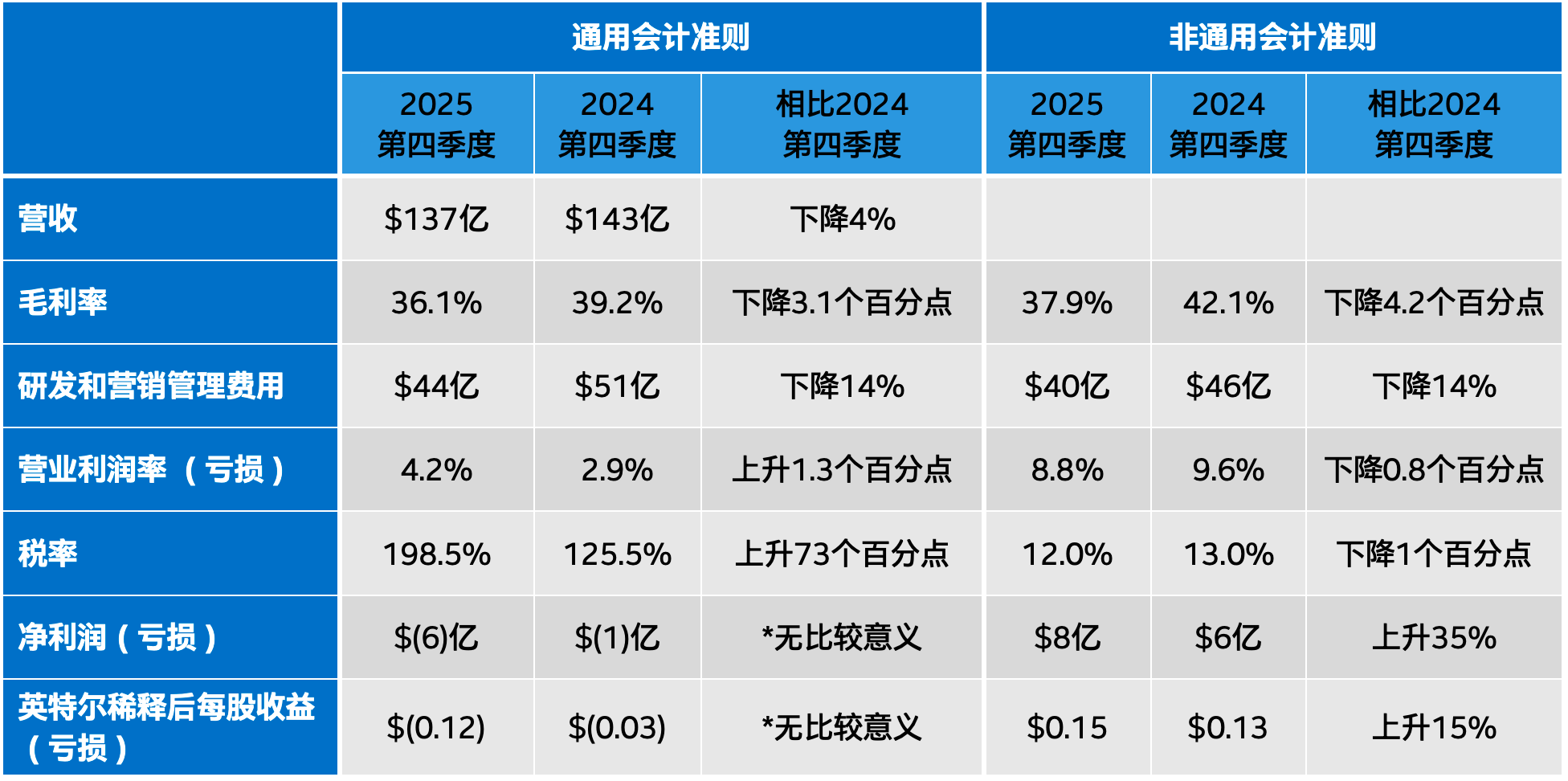 ●第四季度营收137亿美元,同比下降4%。全年营收529亿美元,与去年持平。上述同比数据尚未针对2025年第三季度剥离Altera业务进行调整。