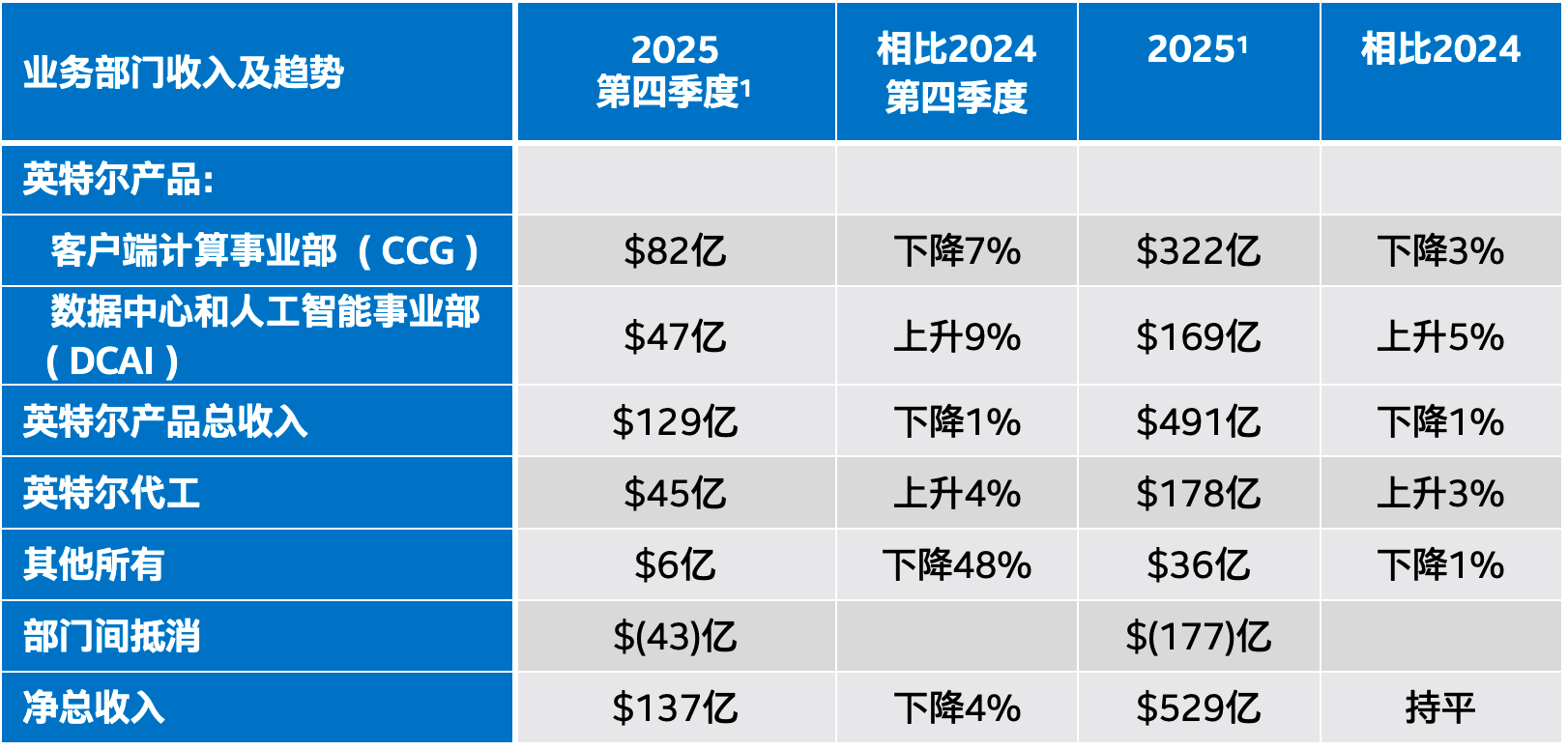 2025年第一季度,公司实施了组织架构调整,将网络与边缘事业部(NEX)整合至客户端计算事业部(CCG)和数据中心与人工智能事业部(DCAI),并据此修订业务分部报告,以配合此次架构调整及相关业务调整。所有历史期间的业务部门数据已追溯调整,以体现英特尔内部接收信息及管理和跟踪各业务部门绩效的方式。自2025年9月12日起,在Altera(前身为英特尔全资子公司)所发行的51%普通股完成出售后,Altera已从英特尔的合并财务报表中剥离。截至2025年9月11日,Altera的经营业绩均包含在英特尔的合并财务业绩及其“其他所有”业务单元类别中。英特尔合并财务报表的前期数据并未发生任何变化。
