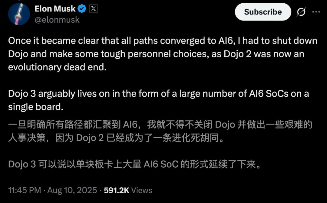 谁曾想,去年8月,马斯克一条帖子,直接给Dojo 2判了「死刑」。