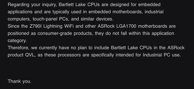 华擎表示,"Bartlett Lake" 处理器通常用于嵌入式主板、工业计算机、触摸屏电脑及类似设备,而这与 Z790I Lightning WiFi 等旗下 LGA1700 主板的应用场景存在差异。