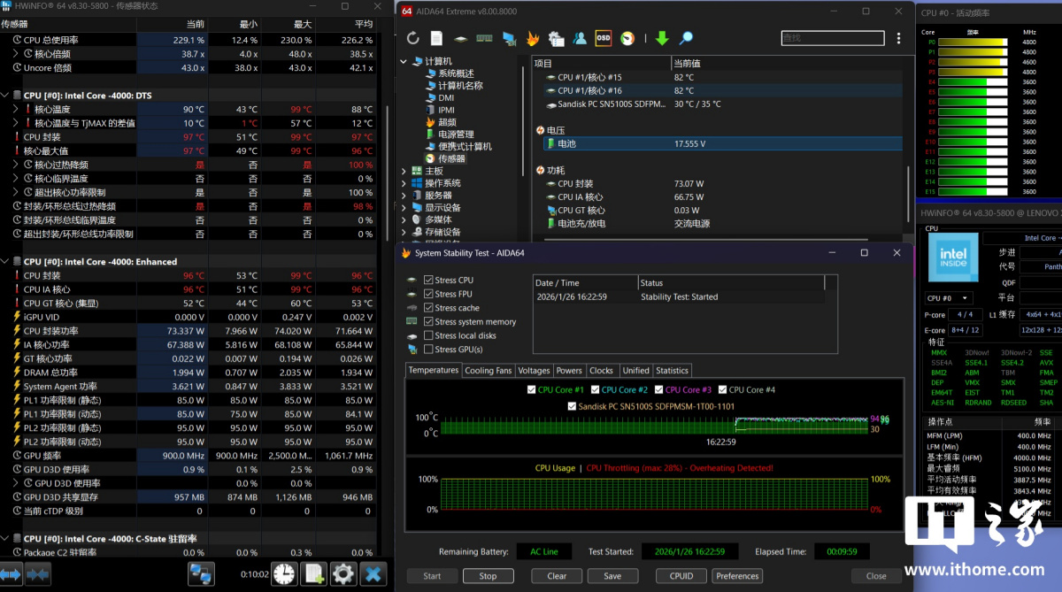 首先看烤机表现,经过 10 分钟的 AIDA64FPU 单烤后,这颗酷睿 Ultra X9 处理器 388H 的功耗维持在 75W 左右,4 颗性能核频率保持在 4.8GHz,其它 12 个核心的频率都在 3.6GHz,而此时的 CPU 温度保持在 90℃,CPU 封装温度达到了 96℃。虽然作为一台轻薄本,日常使用基本不会有 FPU 烤机这样的极端负载场景,但联想小新 Pro GT 16 AI 元启版的性能调度在极客模式下还是比较激进的。