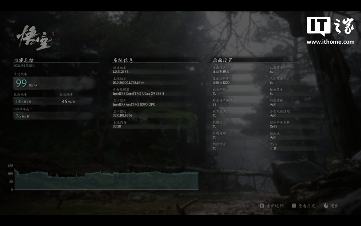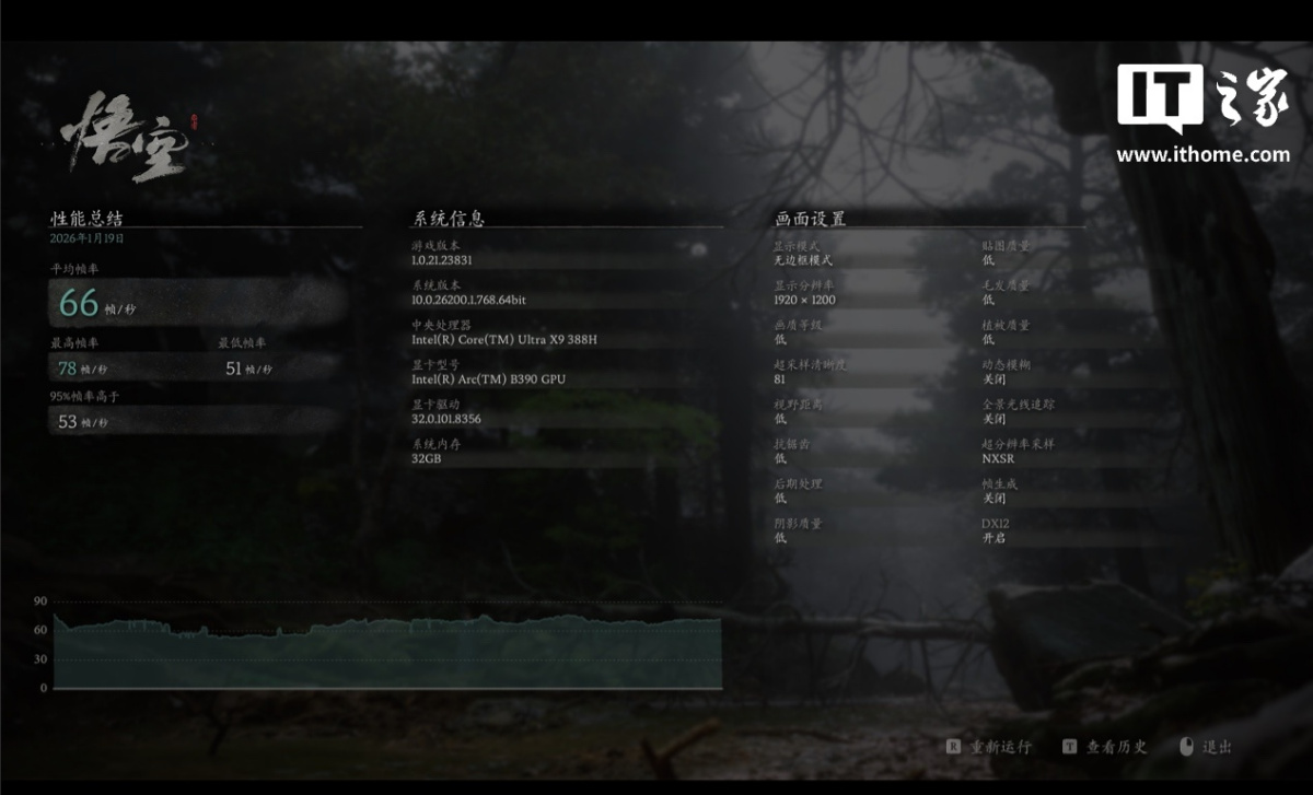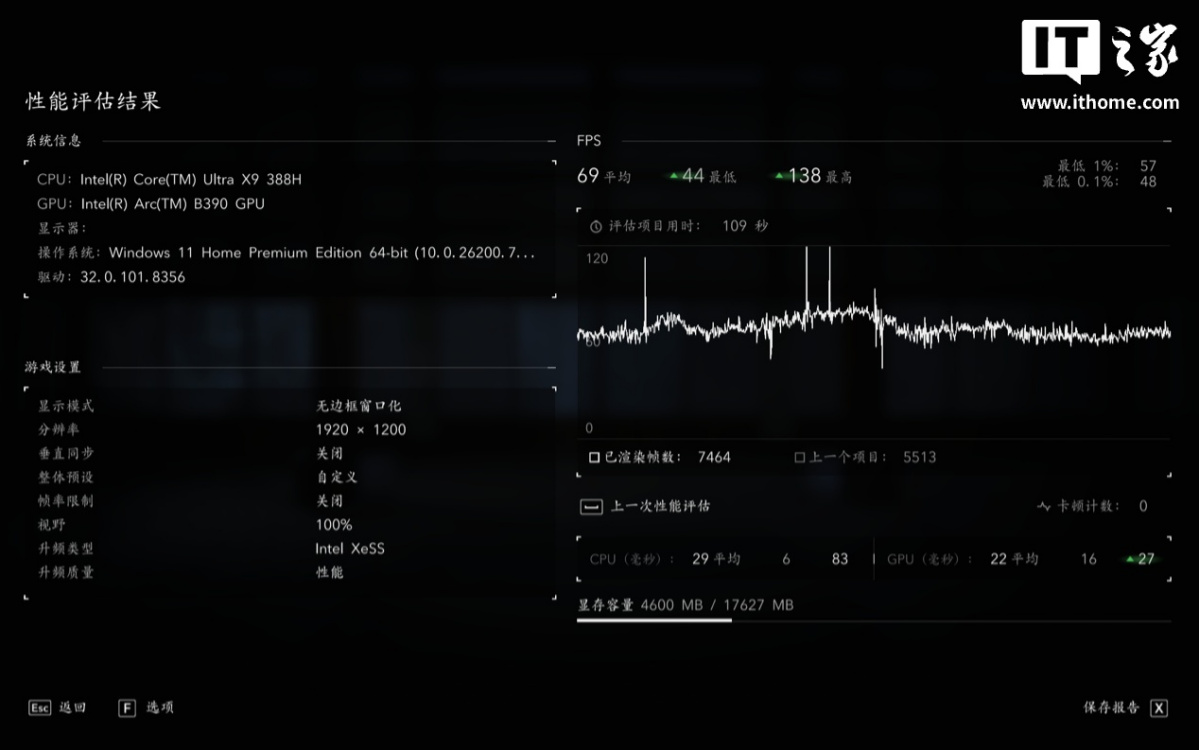 《刺客信条:影》这款游戏对 CPU、GPU 的性能要求都很高,在 1200P 分辨率 + 手动全低画质预设 + XeSS 性能 + XeSS 帧生成的画面设置下,运行游戏自带基准测试,游戏平均帧数为 69 帧,1% Low 为 57 帧。如果以 60 帧作为流畅线,那么 Intel Arc B390 核显刚好达到了流畅水平。