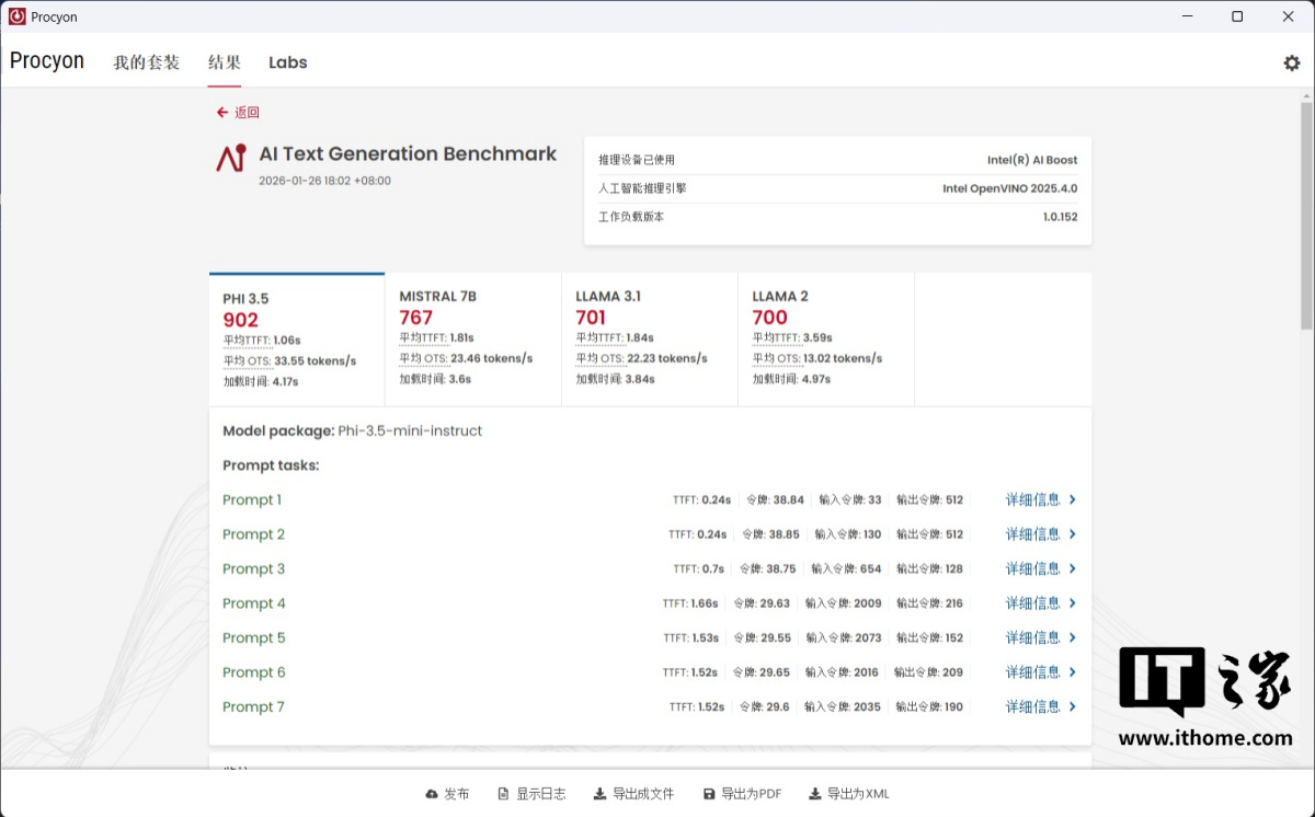 UL Procyon 的 AI 文本生成基准测试中,GPU 的 PHI3.5 模型 1530 分;MISTRAL 7B 模型 1186 分;LLAMA 3.1 模型 1188 分;LLAMA 2 模型 1346 分。