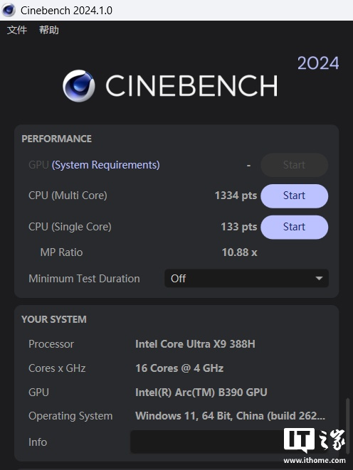 CPU 多线程分数为 1334 分,相比酷睿 Ultra 9 285H 的 1147 分,提升了 16.3%;