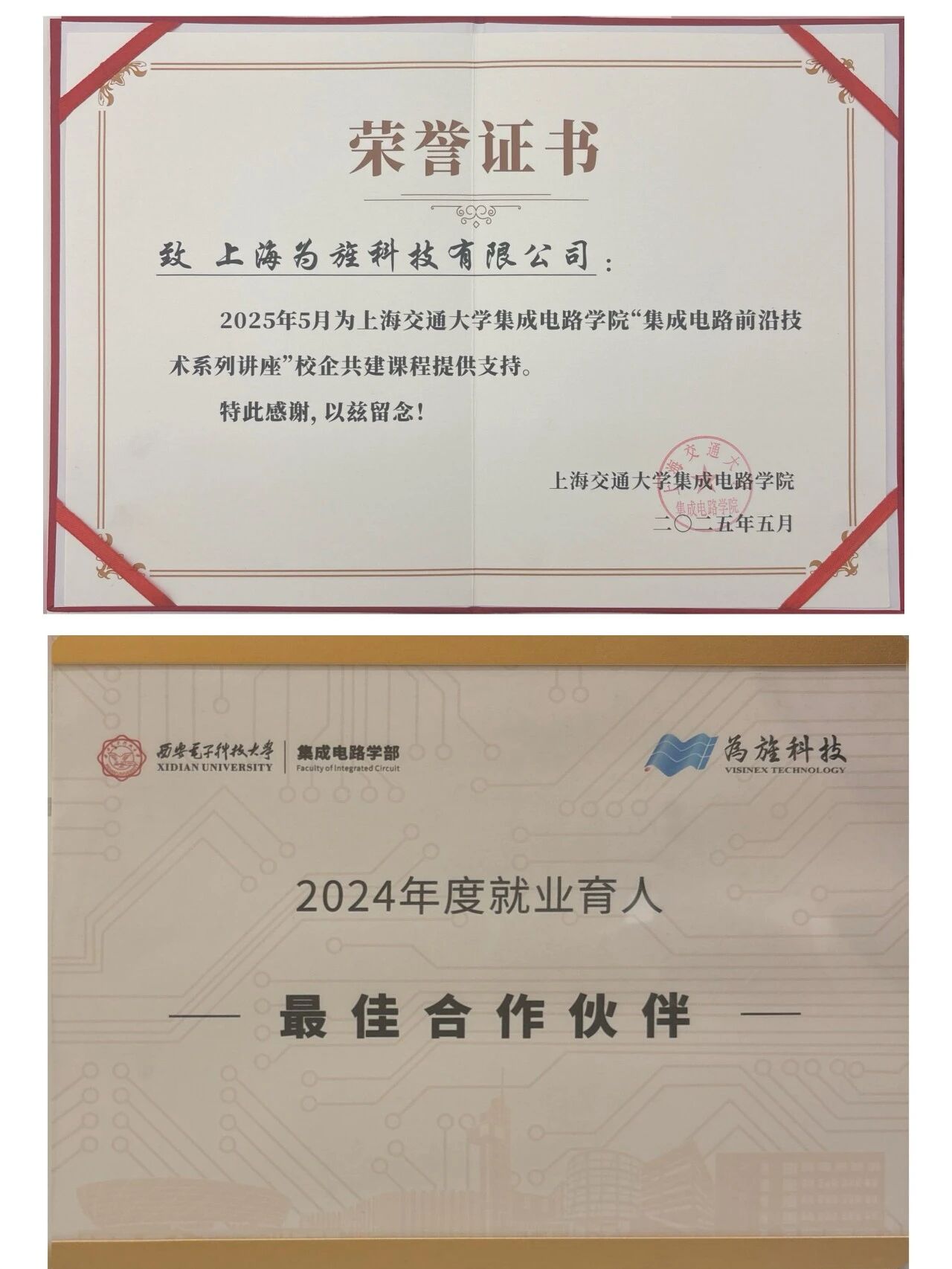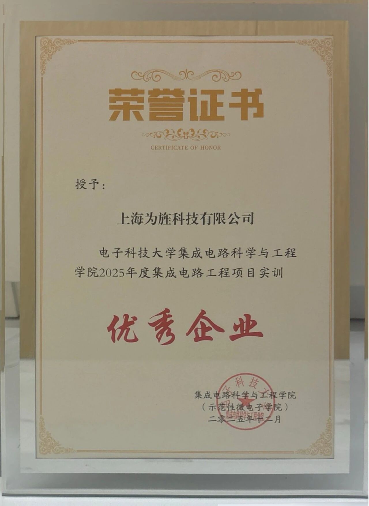近日,为旌科技荣获电子科技大学集成电路科学与工程学院颁发的“2025年度集成电路工程项目实训优秀企业”证书。这既是对我们校企协同育人成果的肯定,也是一份责任与激励——在半导体与人工智能产业加速演进的当下,企业不仅要深耕技术,更要持续投入长期人才培养。