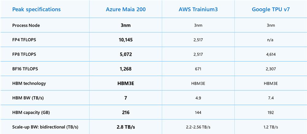 互连方面,Maia 200提供2.8TB/s双向专用扩展带宽,高于AWS Trainium3的2.56TB/s和谷歌TPU v7的1.2TB/s。
