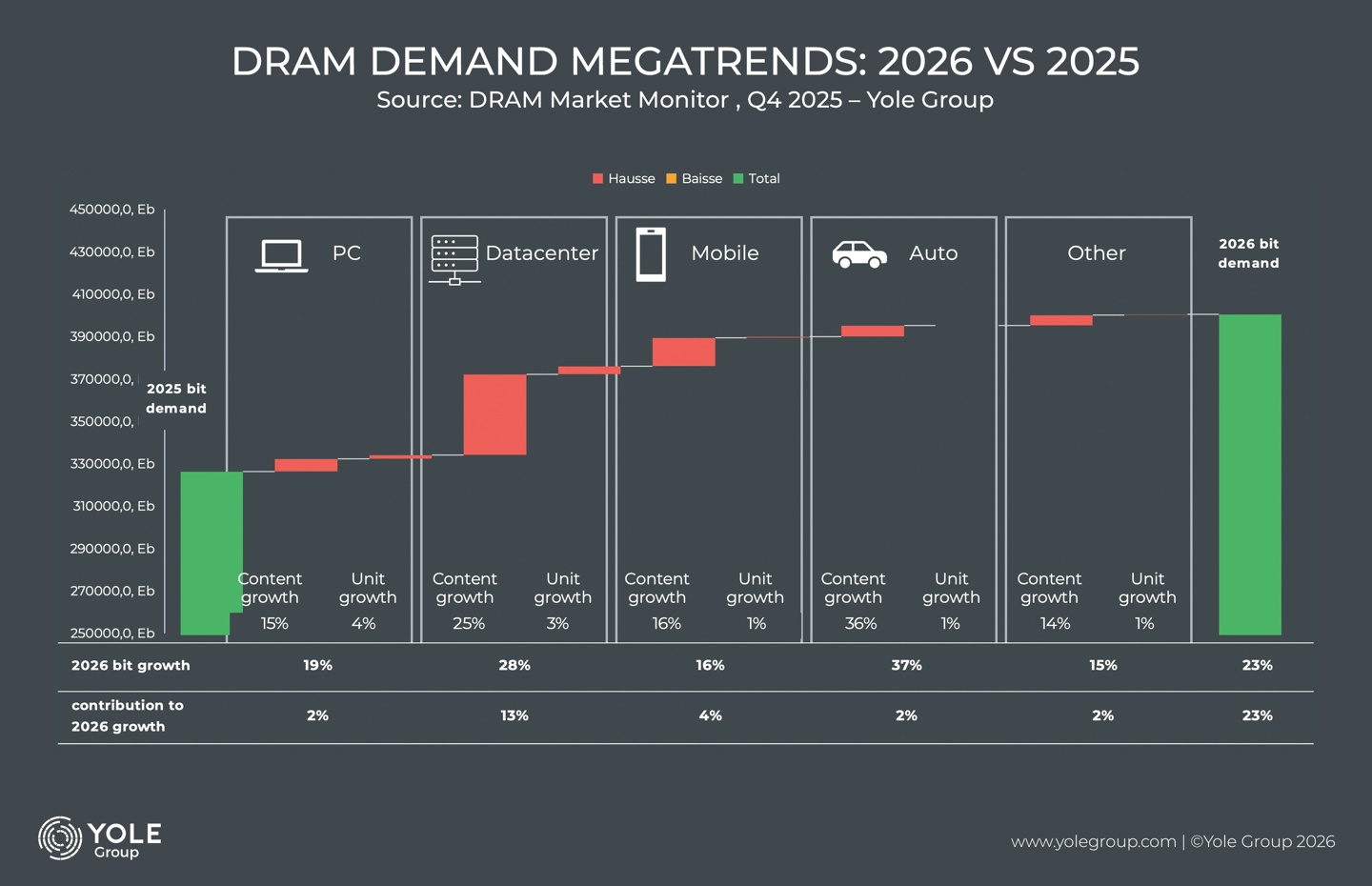 IT之家 1 月 27 日消息,机构 Yole 在近期的报告中指出,2026 年全球按容量 (bit) 计算的 DRAM 内存需求将同比增长 23%,其中数据中心领域将增长 28%,对整体增幅贡献 (13%) 超过半数。