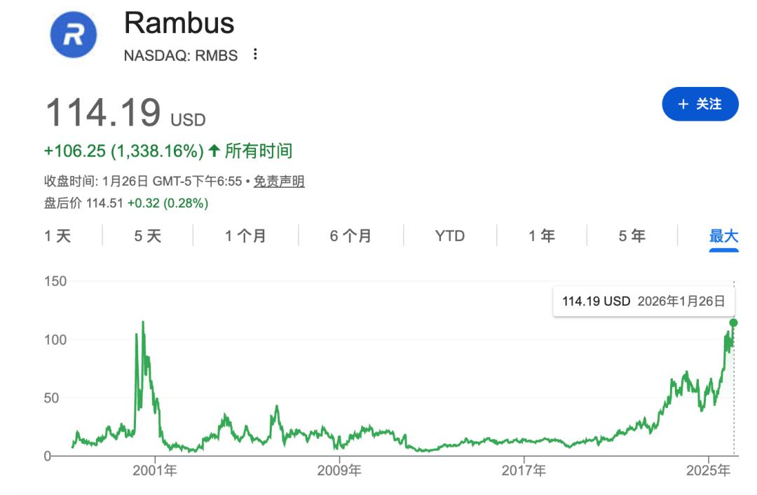 截至2026年初,Rambus股价已站上约115–125美元高位,并一度触及 135 美元的区间高点,过去一年累计涨幅接近 100% 左右,在市场上表现异常抢眼。投资者对此既看到了 AI 时代对其技术的需求提升,也反映出市场对其未来增长路径的预期显著改变。