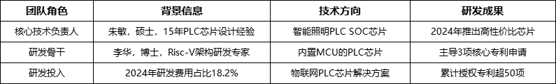 研发团队核心优势与公司战略高度适配:一是团队成员均具备10年以上PLC芯片设计经验,朱敏主导的智能照明PLC SOC芯片直接响应下游智能化升级需求,强化产品竞争力;二是研发投入持续保持高位(2024年占比18.2%),累计专利超50项,筑牢技术壁垒,支撑“PLC技术+物联网应用”的战略落地;三是技术方向聚焦内置MCU的PLC芯片,适配智能家居、智能照明等多场景需求,与公司拓展物联网应用场景的目标一致,可提升解决方案的市场覆盖度,助力公司在PLC芯片领域的行业地位持续提升。
