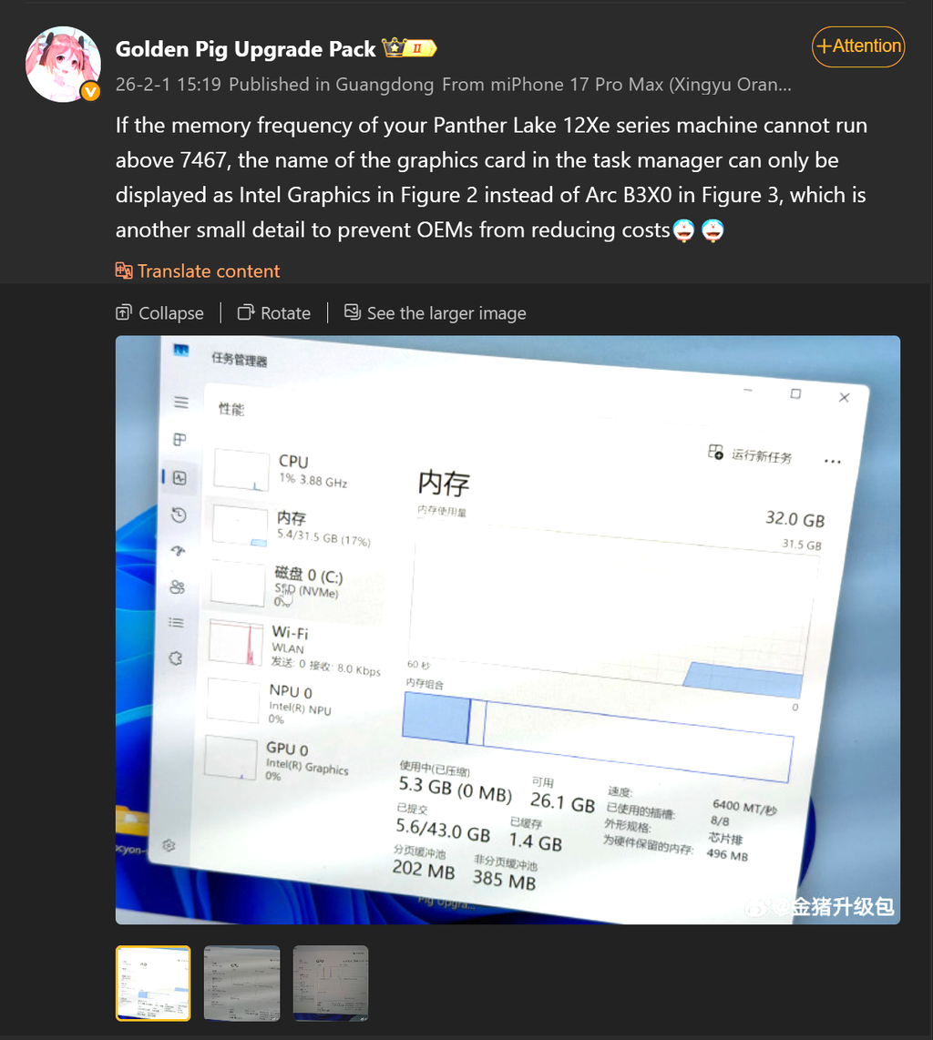据知名爆料人士Golden Pig Upgrade透露,英特尔已将7467 MT/s设定为Panther Lake芯片所搭配的LPDDR5X内存的最低门槛。若内存速度未达此标准,则其出色的集成显卡将在任务管理器中被悄然降级为“英特尔显卡”。