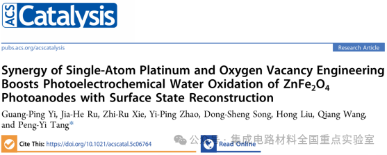 Guang-Ping Yi, Jia-He Ru, Zhi-Ru Xie, Yi-Ping Zhao, Dong-Sheng Song, Hong Liu, Qiang Wang, Peng-Yi Tang*. Synergy of single-atom platinum and oxygen vacancy engineering boosts photoelectrochemical water oxidation of ZnFe2O4 photoanodes with surface state reconstruction. ACS Catalysis, 2026,