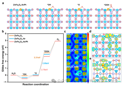 如图6所示,进一步利用密度泛函理论(DFT)计算,从原子与电子尺度系统揭示了单原子Pt与氧空位协同改性对ZnFe2O4光阳极表面水氧化催化活性的增强机制。计算结果表明,该协同策略可优化表面局域电子结构、降低反应能垒,从而显著提升光电化学分解水的本征活性。
