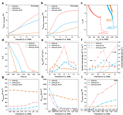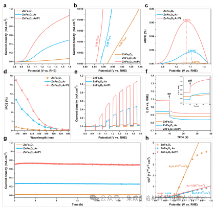如图3所示,对表面改性的ZnFe2O4光阳极进行光电化学性能测试,相较于原始未优化的样品,基于Pt单原子/氧空位工程协同调控的铁酸锌光阳极器件在1.23 VRHE的光电流密度从0.02 mA/cm2增强至0.7 mA/cm2,实现了35倍的性能增强。同时,光电压等关键性能参数均得到同步优化,表明表面工程策略对器件整体光电化学性能具有系统性增强作用。