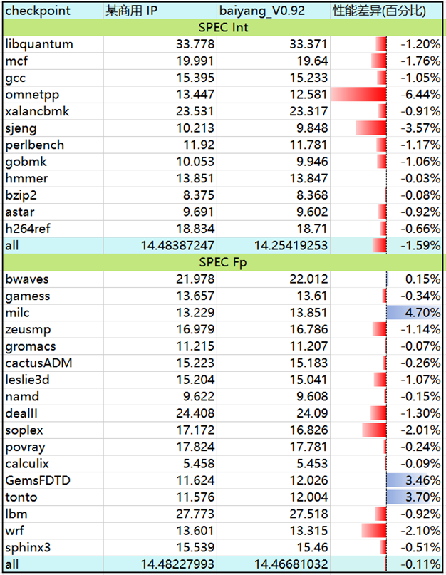 在性能方面,集成了“昆明湖”核与“白杨”内存控制器的系统,在 SPEC CPU2006 基准测试中取得了超过 14 分 / GHz 的成绩,性能水平已接近商用内存控制器 IP。