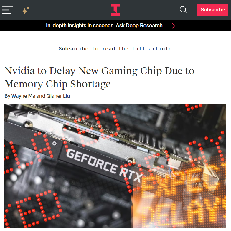 IT之家 2 月 5 日消息,据 The Information 今日报道,由于内存芯片短缺,英伟达推迟推出新款游戏芯片。