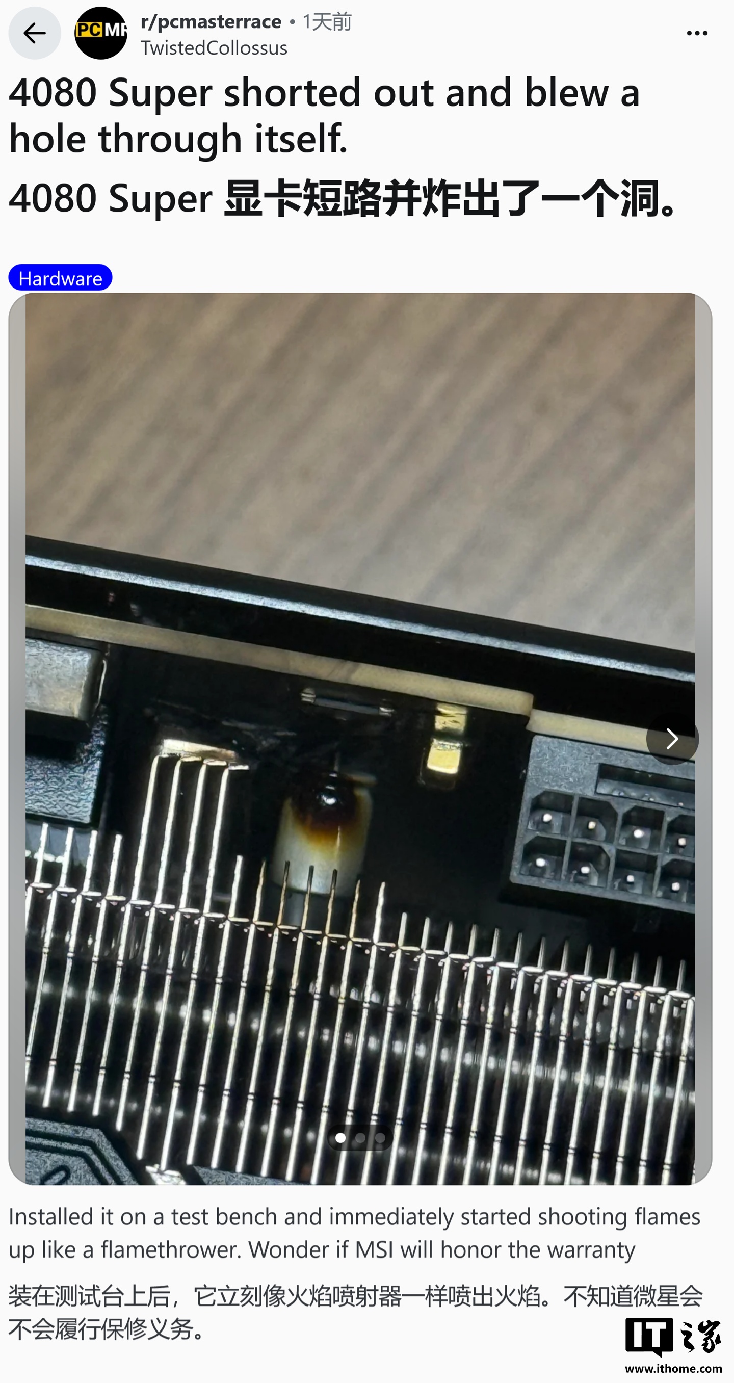 IT之家 2 月 7 日消息,网友 u/TwistedCollossus 昨日(2 月 6 日)在 Reddit 社区发帖,分享了遭遇的一起极端的显卡故障,RTX 4080 Super 显卡在测试平台上通电后几乎立即起火。