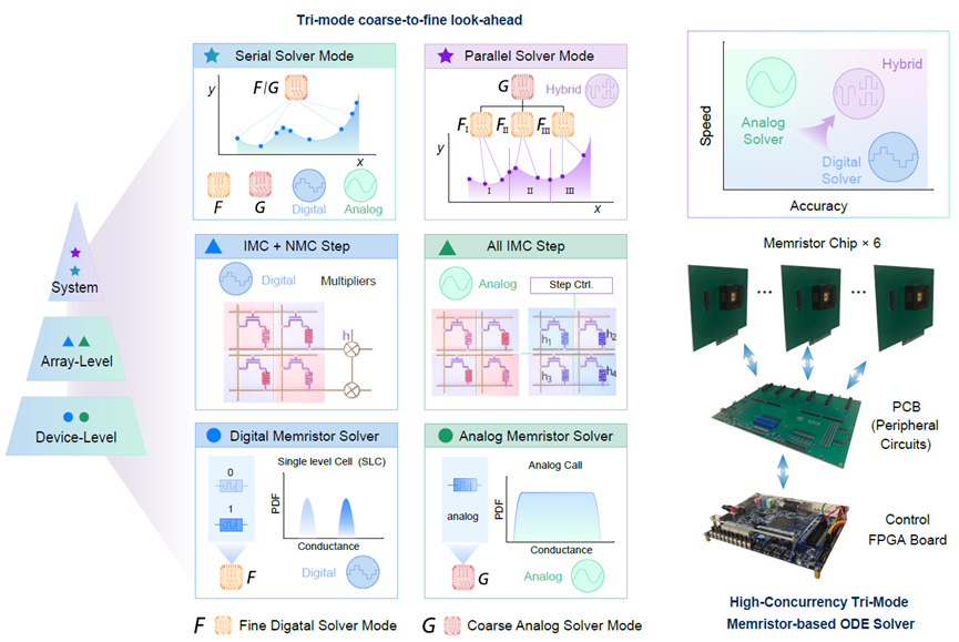 相关成果以“High-concurrency tri-mode memristor-based ordinary differential equation solver”为题,发表于国际顶尖期刊《自然∙通讯》(Nature Communications)。北京大学集成电路学院博士生余连风为第一作者,集成电路学院杨玉超教授与人工智能研究院陶耀宇研究员为通讯作者。相关工作得到了新基石研究员项目、国家重点研发计划、国家自然科学基金、广东省存算一体芯片重点实验室、北京市自然科学基金等项目的资助。(来源:北京大学集成电路学院)