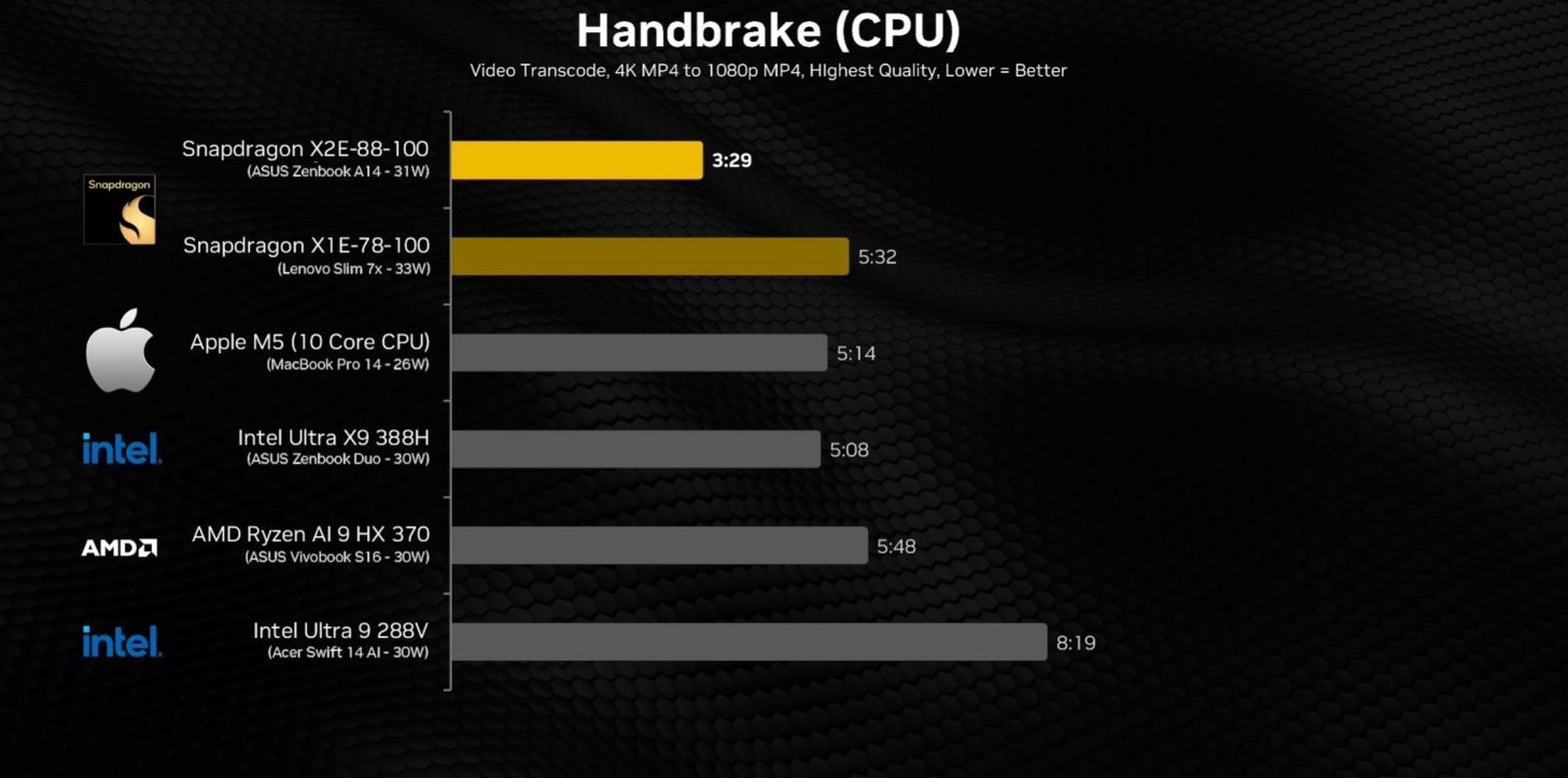 IT之家 2 月 9 日消息,高通去年已推出骁龙 X2 Elite Extreme 与骁龙 X2 Elite 处理器,其中定位稍低的这款 SoC 已在一系列 CPU、GPU 基准测试中经受了考验。测试结果令人意外:在部分项目中,高通骁龙 X2 Elite 不仅大幅领先其上一代产品,甚至在部分场景下超越了苹果的 M5。