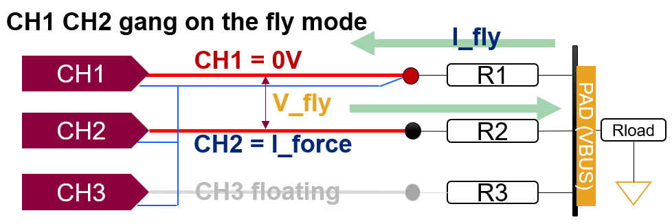 CH1 和 CH2使用Gang On the Fly模式。CH1 施加 0V 电压,CH2 施加电流I_force,然后测量 CH1 电流 I_fly 和 V_fly可得出 R1+R2接触阻抗,实现对管脚之间的接触阻抗监控。
