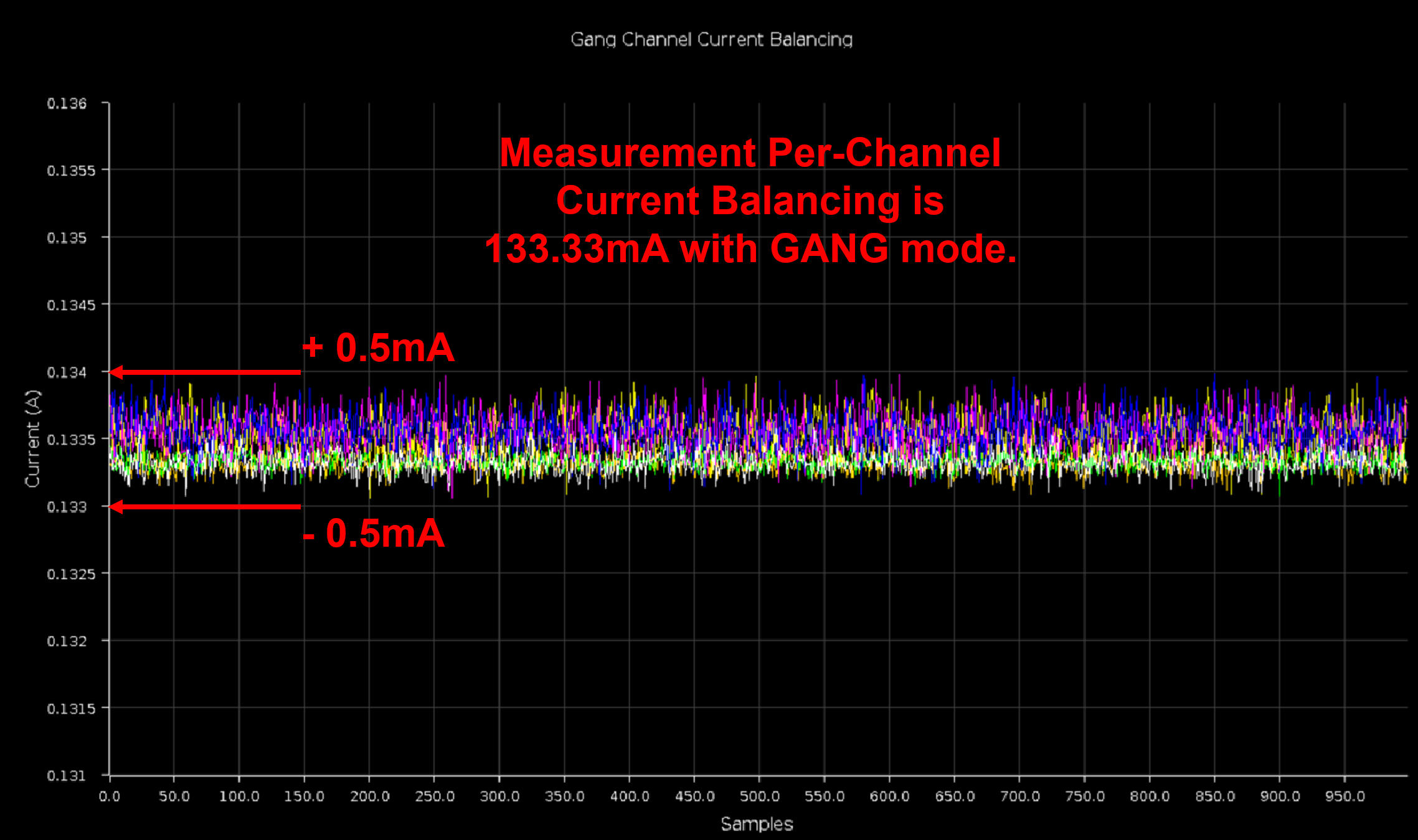 下面展示在高压快充模式,实际测得6个Gang Channel的电流,结果表明使用Independent FORCE Ganging的架构可以使6个通道实现电流均衡且电流精度高达1mA,测试结果如下: