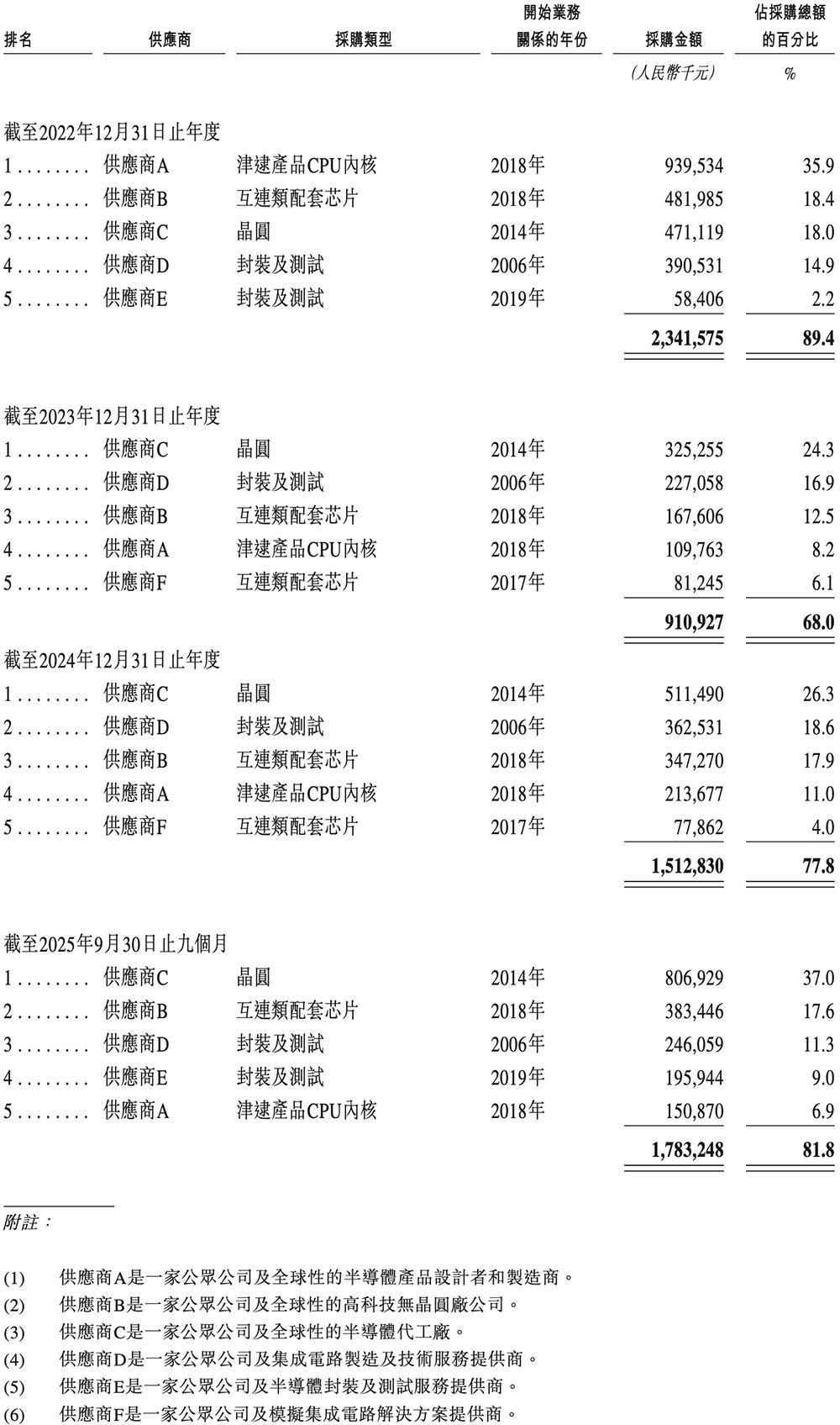 澜起科技的前五大供应商采购额分别占当期采购总额的89.4%、68.0%、77.8%、81.8%,集中度同样较高。