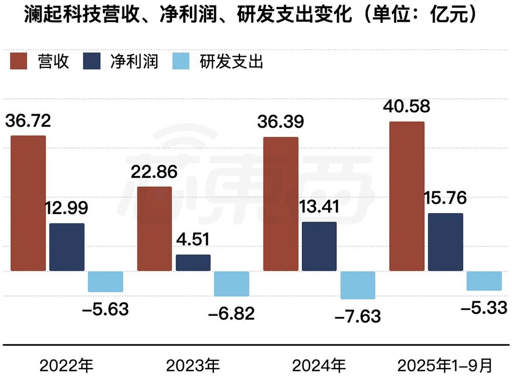 2022年、2023年、2024年、2025年1-9月,澜起科技的收入分别为36.72亿元、22.86亿元、36.39亿元、40.58亿元,净利润分别为12.99亿元、4.51亿元、13.41亿元、15.76亿元,研发费用分别为5.63亿元、6.82亿元、7.63亿元、5.33亿元,整体毛利率分别为46.4%、58.9%、58.1%、61.5%。