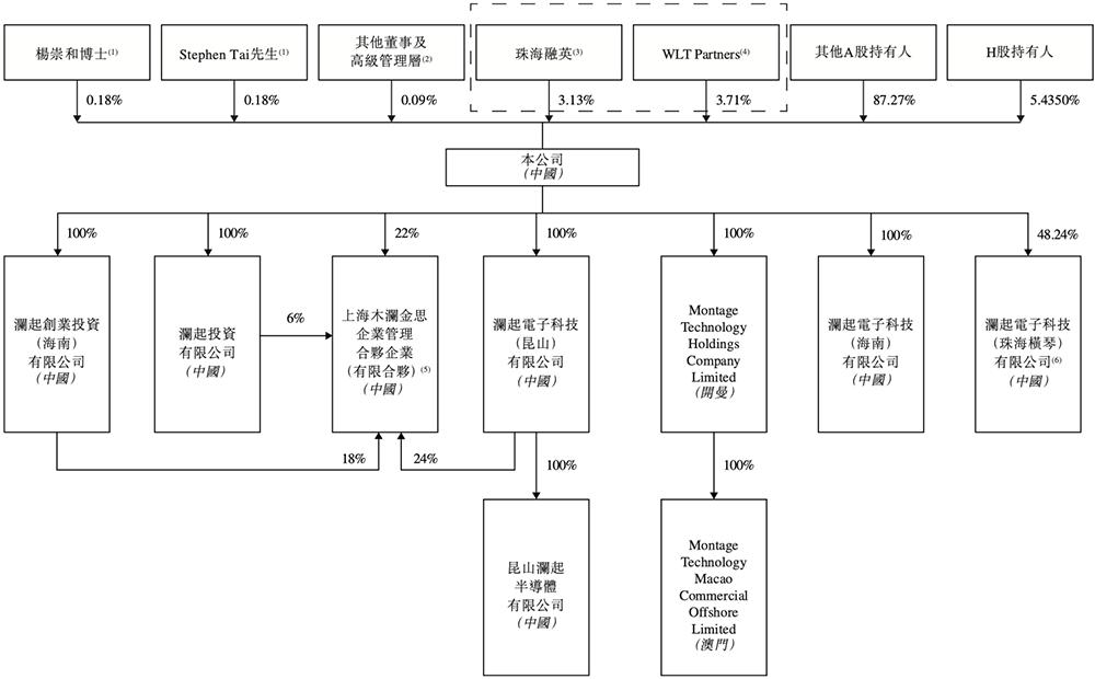 截至2026年1月20日,WLT Partners及珠海融英为一致行动人士,共有全部已发行股份的7.23%权益。WLT Partners、WYK Co., Ltd.、Tai Kuai Lap、珠海融英、杨崇颐及白雪共同构成澜起科技的单一最大股东集团。