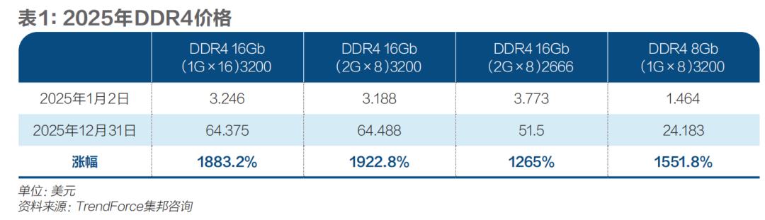 从2025年4月开始,DDR4现货市场价格一路飙升,6月起更是出现16GB DDR4现货价格反超DDR5的罕见倒挂。TrendForce集邦咨询数据显示,部分规格的DDR4单条价格在2025年年初不到3.2美元,2025年涨到64.5美元,涨幅高达1922.8%。