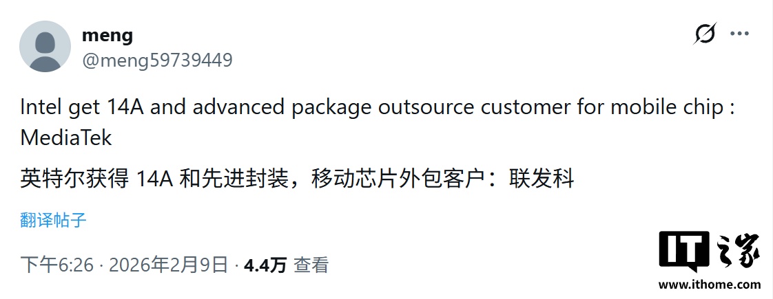 IT之家 2 月 10 日消息,科技媒体 Wccftech 昨日(2 月 9 日)发布博文,报道称英特尔代工业务成功争取重量级客户联发科(MediaTek),有望通过其最先进的 14A 工艺量产天玑(Dimensity)移动芯片。