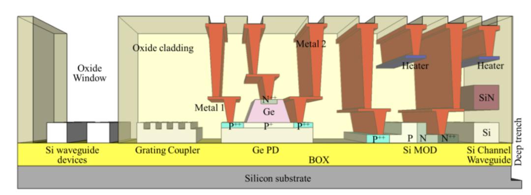在硅光子学中,通常不使用CMOS晶体管(硅光子学和CMOS的集成已经开始——GF公司有一种将两者结合起来的工艺——但目前还不普遍)。硅光子学工艺中通常可用的器件包括: