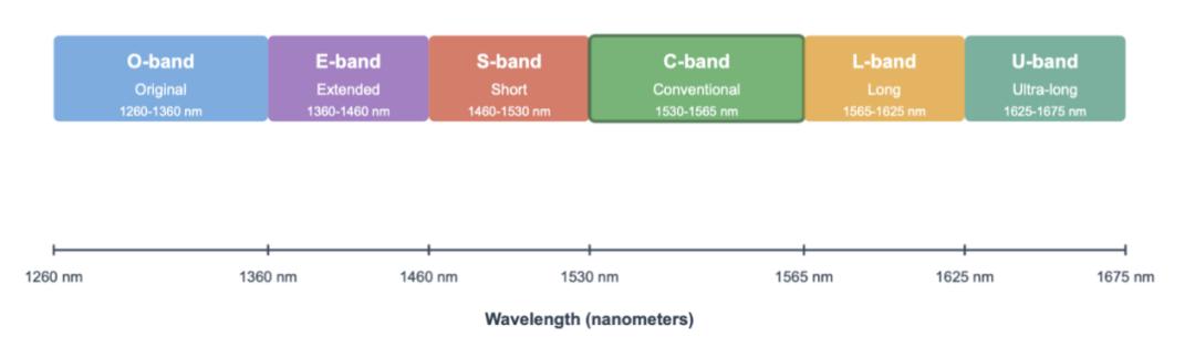 光纤通信中使用的波长是O波段、E波段、S波段、C波段和L波段,因为这些波段在光纤中的信号损耗相对较低。它们都位于红外光谱范围内。
