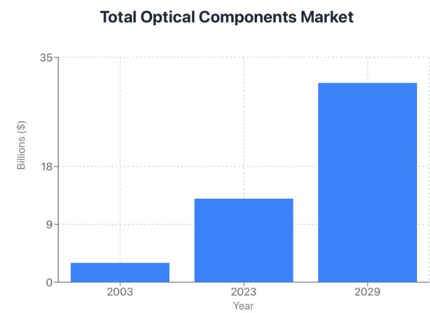 在2025年光纤通信展(OFC 2025)上,OMDIA发布的光纤器件市场预测显示,市场规模已从2003年的数十亿美元(主要应用于电信领域)增长到2023年的约130亿美元,此后增长速度将显著加快,预计到2030年将达到250亿美元,这主要得益于人工智能网络的发展。首先是横向扩展,几年后是纵向扩展。CignalAI最新的预测则认为,到2029年,市场规模将达到310亿美元。