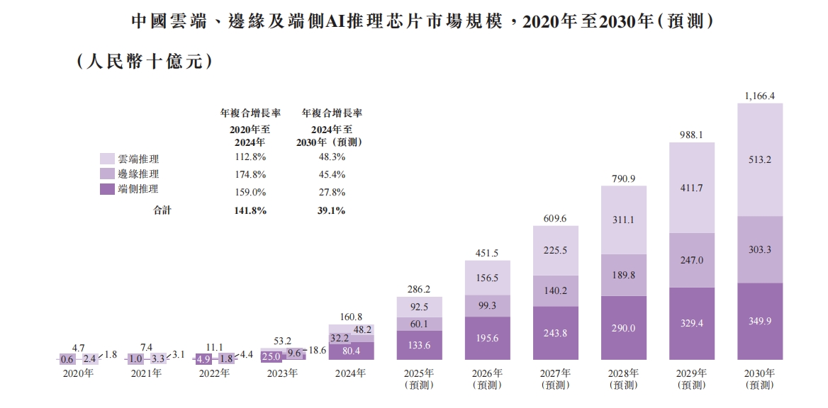 算力范式转移正在催生出万亿级潜在市场空间。根据灼识咨询的数据,2024年,全球边缘推理及端侧推理芯片规模为3793亿元人民币,而到2030年,全球边缘推理及端侧推理规模则会扩张至16123亿元,CAGR高达27%。