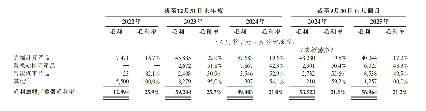 三是,结构优化驱动价值中枢上移。从毛利率看,智能汽车和边缘推理产品的毛利率拉动整体毛利率提升。根据招股书信息,2025年前三季度,公司智能汽车产品和边缘推理产品的毛利率分别为43.3%和49.5%,随着高单价、高毛利产品的放量,公司产品结构优化,带动单位价值量上移,进一步拓宽了未来的收入边界,并有望带动利润的释放。