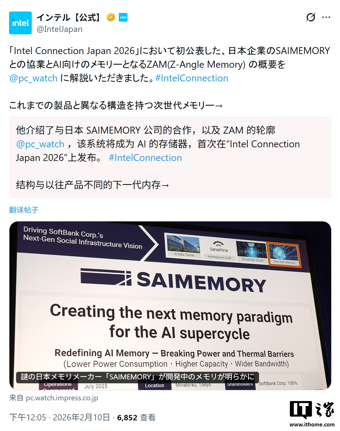 《软银旗下 SAIMEMORY 与英特尔签署正式协议,携手推动 ZAM 内存商用化》