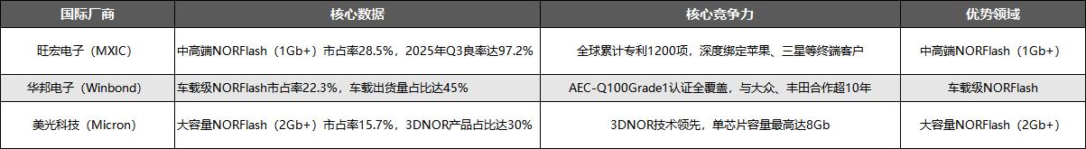 竞争格局方面,当前全球NORFlash市场呈现“国际寡头垄断,国内分层竞争”的格局。国际市场上,旺宏电子、华邦电子、美光科技等国际巨头占据了全球66.5%的市场份额,其核心优势如下表所示: