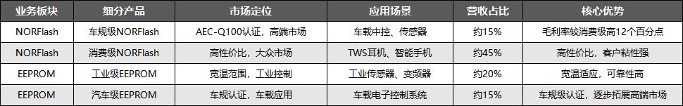 产品矩阵方面,公司核心业务分为NORFlash和EEPROM两大板块,覆盖消费、汽车、工业三大应用领域,形成了“NORFlash贡献主要营收,EEPROM拓展高附加值场景”的合理产品结构,多元化布局有效降低了单一领域的市场波动风险。